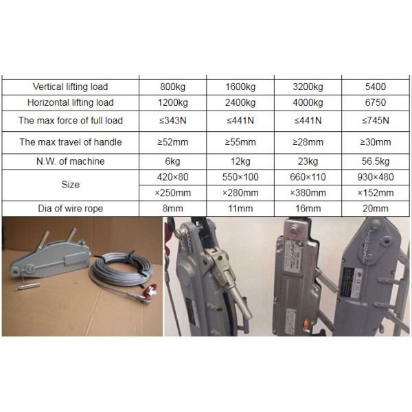 Lever wire rope hoist also named Wire rope pullers feature a lightweight, compact, high strength aluminum housing, smooth contour design with a large, flat bottom surface for increased stability in horizontal and vertical working positions.